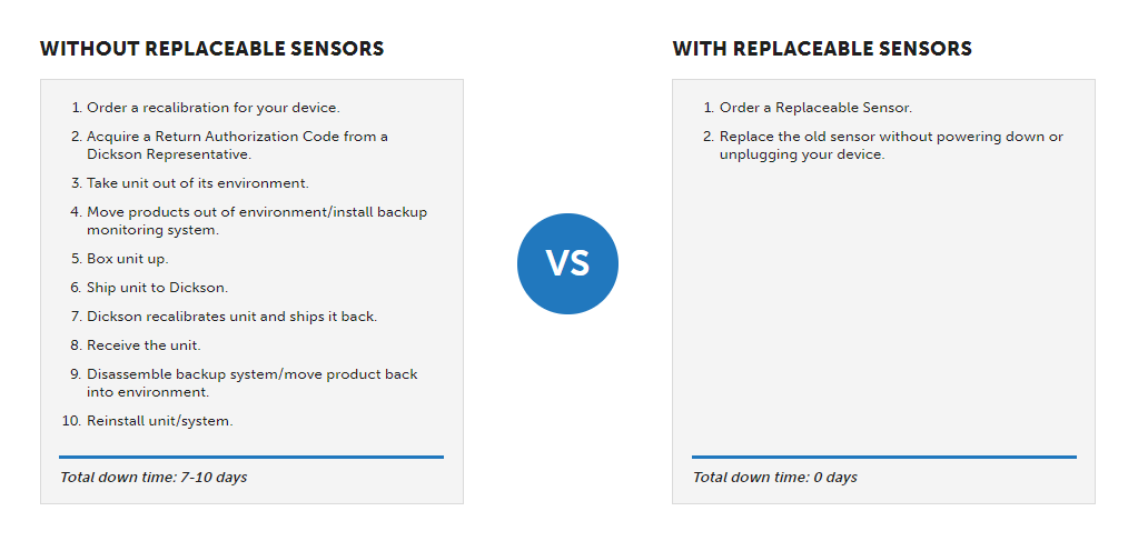 With such a wide selection of data loggers and can be difficult finding the right Dickson Replaceable Sensor. Read more about our replaceable sensor data loggers.
