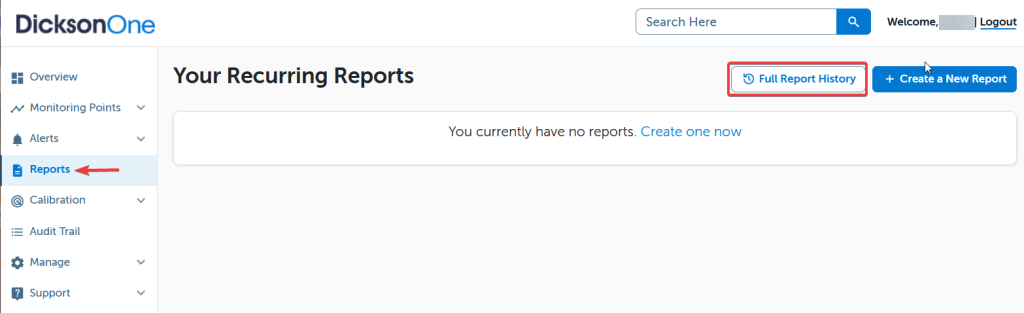 Reports can be viewed on DicksonOne at anytime after they have been delivered. In case you cannot find the report on your email, deleted the email or simply lost the report, the Full Report History option allows you to retrieve the report in a few steps.