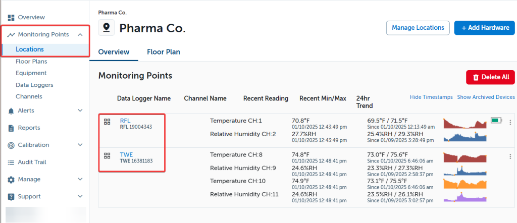The Primary Location (The Company Name in the Account Settings) with Devices Below it. Both Devices are at Pharma Co.