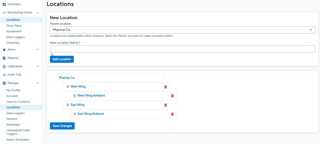 Single Building with Multiple Locations. The Primary Location is Pharma Co. In Pharma Co. there are two main locations, West Wing and East Wing, with additional sub-locations West Wing Ambient and East Wing Ambient.