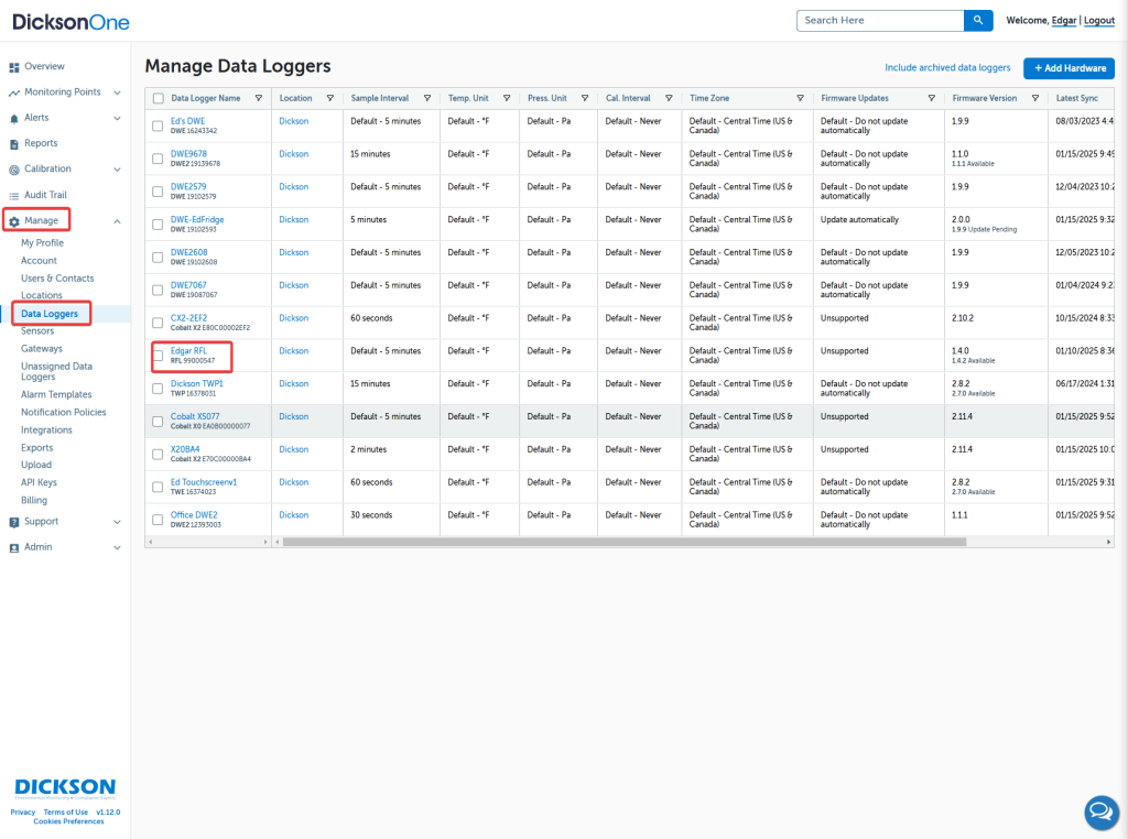 To review your Data Loggers’ settings or make changes go to Manage on the left navigation