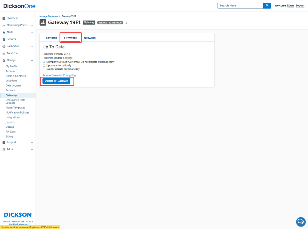 Go to Manage > Gateways on your DicksonOne account and click on the gateway you wish to configure firmware settings for