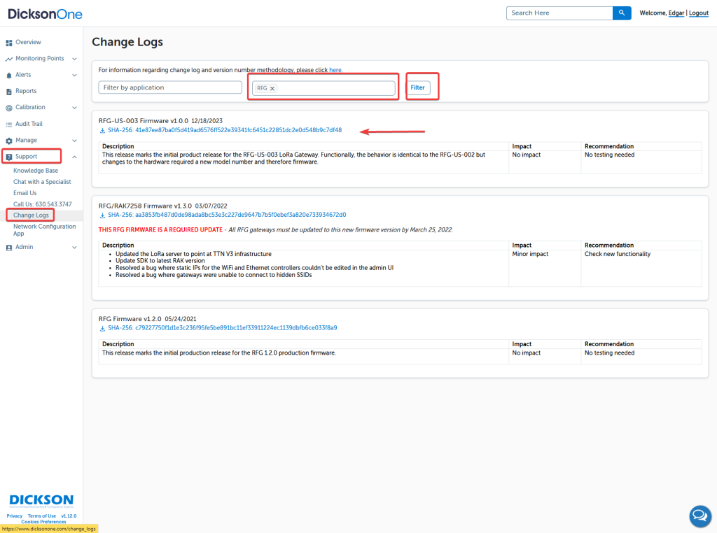 - On your DicksonOne account go to Support > Change Logs and confirm you’re filtered to the RFG device.