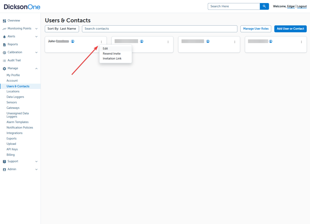 Go to DicksonOne.com > Manage > Users & Contacts
